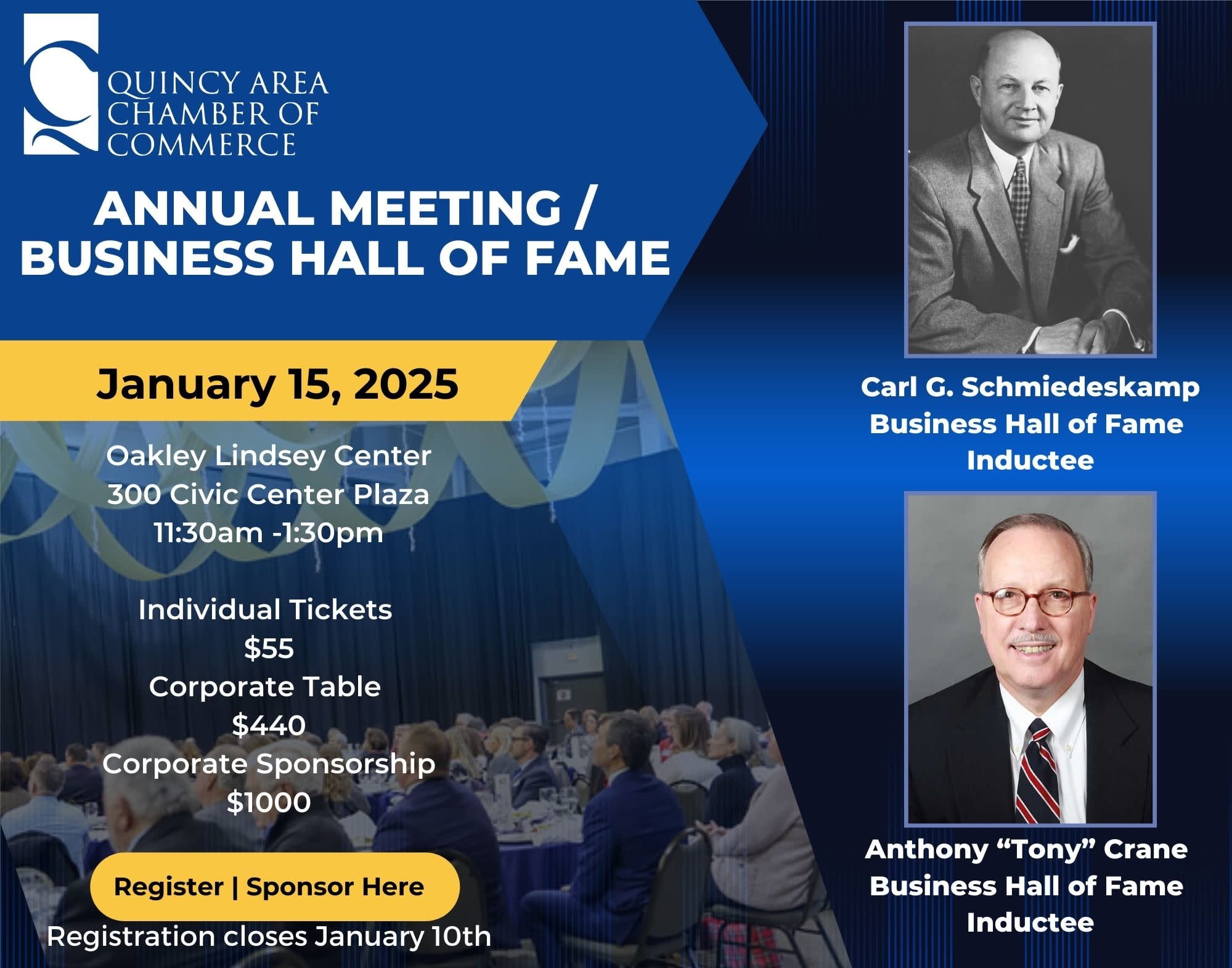 The Business Hall of Fame was started in 2006 to celebrate the rich history and accomplishments of the Quincy area business community. The leaders inducted each year into the Chamber's Business Hall of Fame have spent their lives not only building their businesses but also building our community. We hope that their stories will inspire the next generation of leaders to greatness. Join us as we honor the late Carl G. Schmiedeskamp and Anthony "Tony" Crane our 2025 Business Hall of Fame Inductees