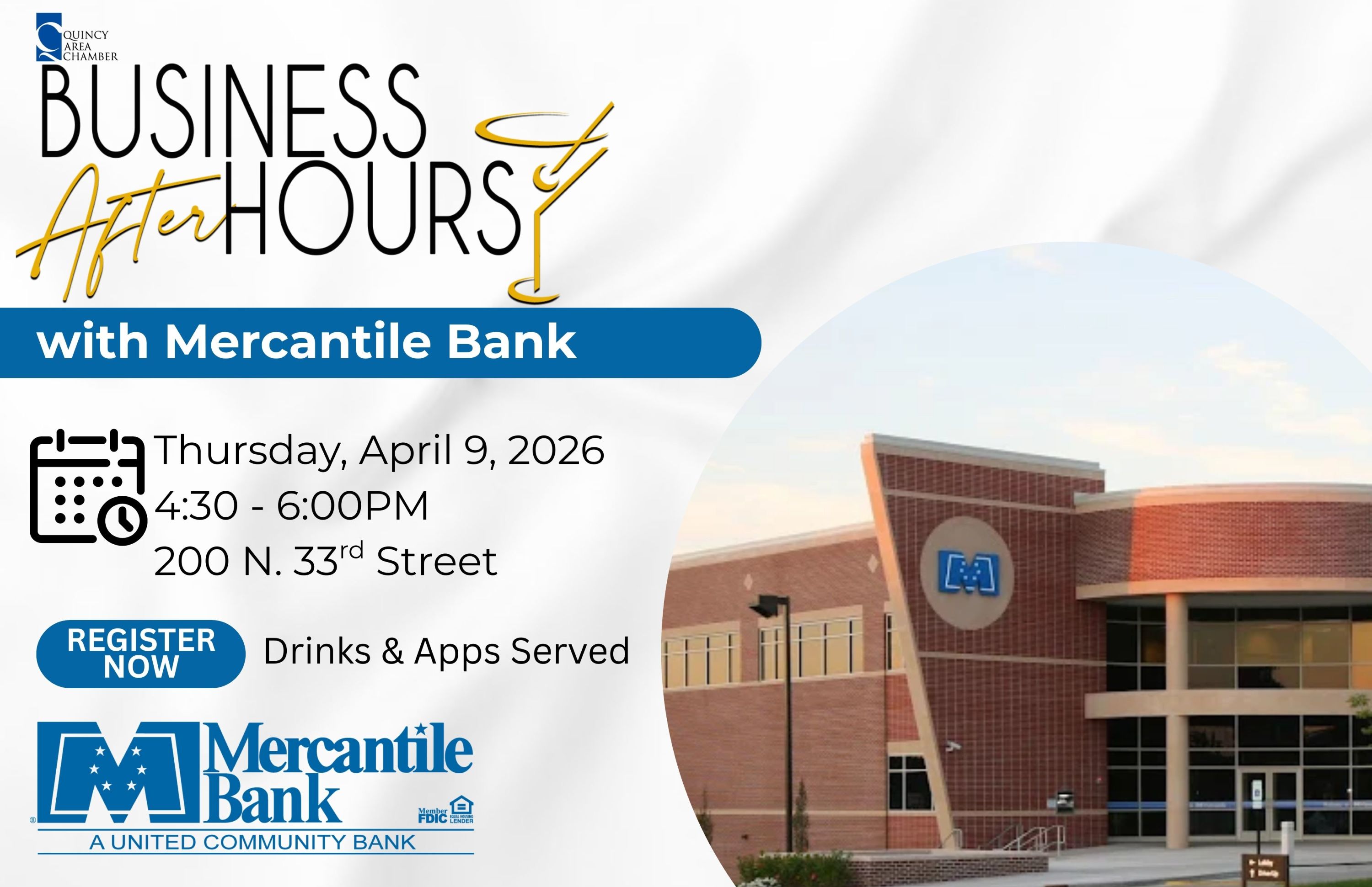 Come join us for the Business After Hours at Mercantile Bank . Gather your business cards and join us for networking, appetizers, drinks and prizes. Reservations required for all 2026 Business After Hours! Don't forget to get your punch card punched for Early Bird Registration to host a 2027 Business After Hours.